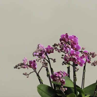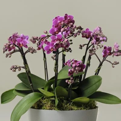 Bright and bold with plenty of character, these miniature pink phalaenopsis orchid plants make a great gift or natural decoration for your own home. This luxury orchid planter is presented in a charcoal grey bowl and stands at approximately 25cm tall.