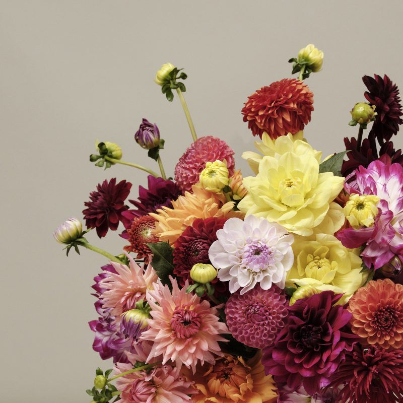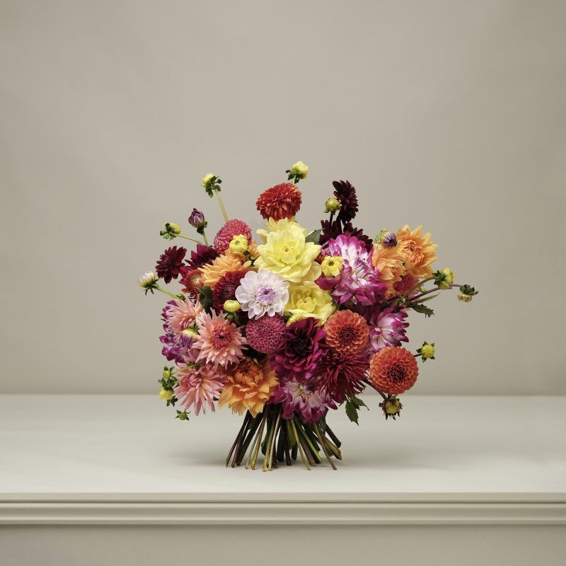 With an abundance of different colours and textures, our informal bouquets of mixed dahlias are grown in the UK and have a much lower carbon footprint than imported flowers. This retro favourite has long been a popular component of the English country garden and is a standout star of rural horticultural shows.