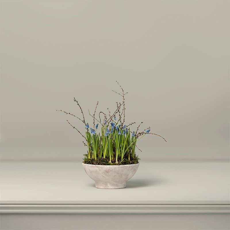 With petite, grape-like flowers in powder blue and vibrant green foliage, these Muscari bulbs are housed in vintage, whitewashed terracotta bowls and neatly finished with fresh moss and supporting larch twigs.