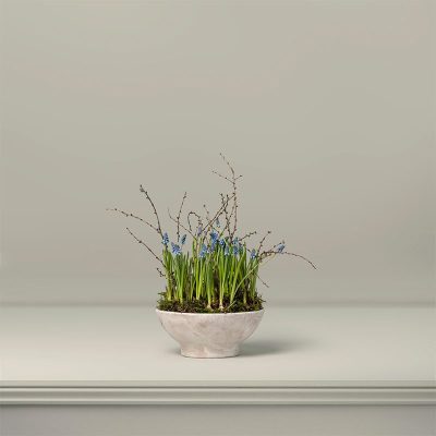 With petite, grape-like flowers in powder blue and vibrant green foliage, these Muscari bulbs are housed in vintage, whitewashed terracotta bowls and neatly finished with fresh moss and supporting larch twigs.