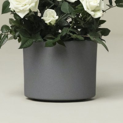 Fitting for any interior, this plant comes with multiple white flower buds and is presented in a charcoal grey ceramic pot, standing approximately 16cm tall.
