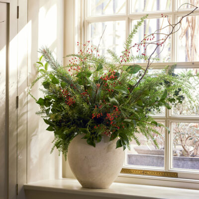 Inspired by winter walks through the English countryside, this wonderfully wild bouquet of British-grown berries and seasonal foliage features an array of rich green tones with touches of festive scarlet. Scots Pine, berried ivy and scented rosemary form a textural backdrop for glistening viburnum berries, red rosehips and skimmia in this understated, seasonal design.