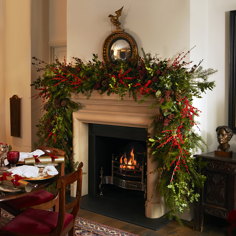 Gleaming scarlet berries, glossy holly foliage and frothy red skimmia join festive fir, larch branches and pinecones in this classic winter garland. It’s the perfect festive adornment for your mantelpiece or bannisters, or place along your dining table for an alternative Christmas table decoration.
