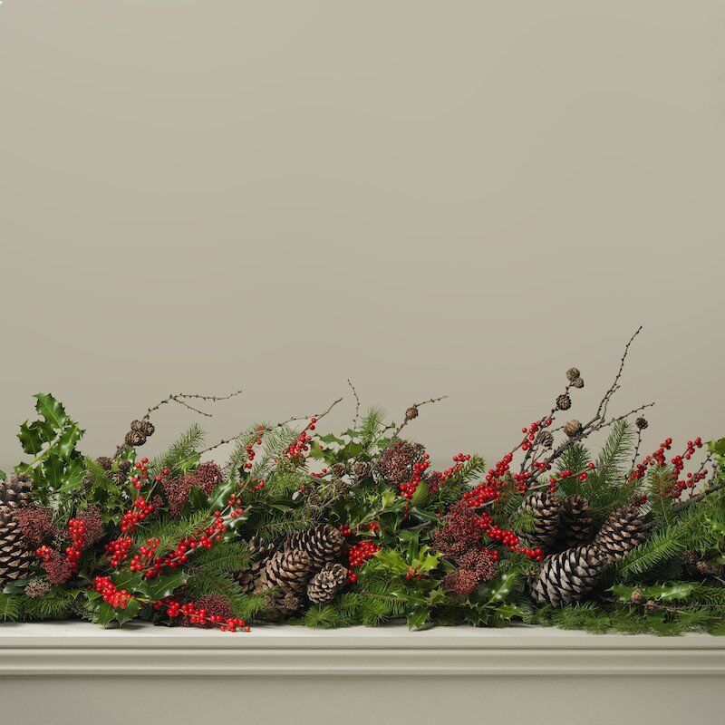 Gleaming scarlet berries, glossy holly foliage and frothy red skimmia join festive fir, larch branches and pinecones in this classic winter garland. It’s the perfect festive adornment for your mantelpiece or bannisters, or place along your dining table for an alternative Christmas table decoration.