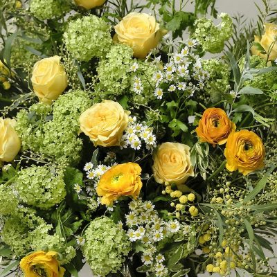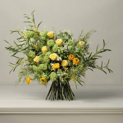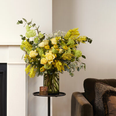 With a decidedly sunny disposition, this Paul Thomas luxury hand-tied bouquet is sure to lift the spirits with its combination of early spring blooms including calming camomile and scented mimosa.