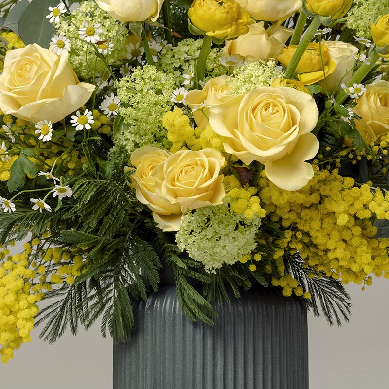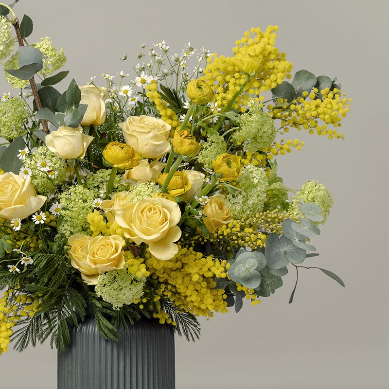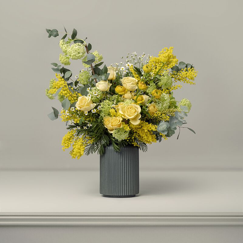 Paired perfectly together, The Blake x The Lutyens makes a statement gift for yourself or loved ones. With a decidedly sunny disposition, this Paul Thomas luxury hand-tied bouquet is sure to lift the spirits with its combination of early spring blooms including calming camomile and scented mimosa.