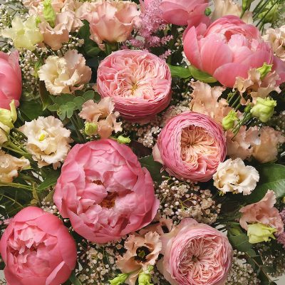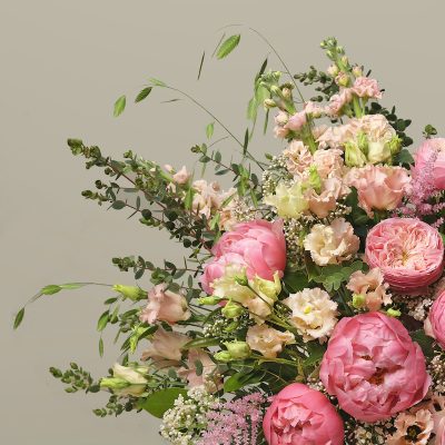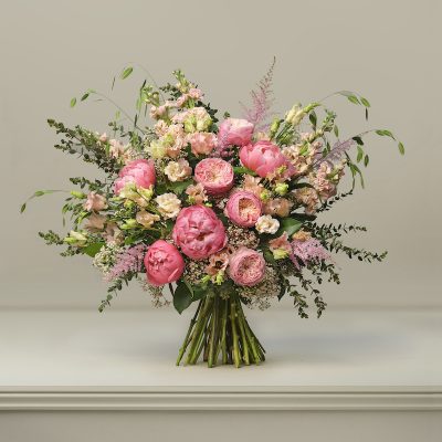 The Christie combines seasonal coral and apricot tones in a sugary bouquet, perfect for the sweet-tooth in your life. Saucer-like garden roses and flamboyant, colour-changing peonies join delicate astilbe and English lisianthus in this riotous yet romantic luxury confection.