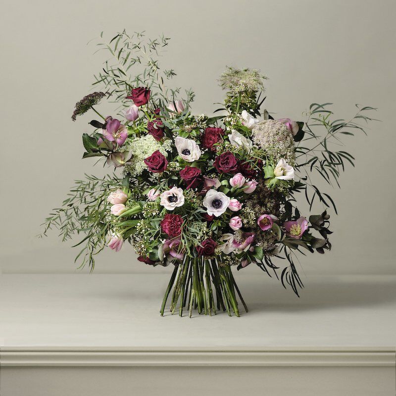 With contrasting shades of deep burgundy and pastel pink, this Paul Thomas luxury hand-tied bouquet features the season’s most sought-after blooms including blush anemones and wine-coloured hellebores.