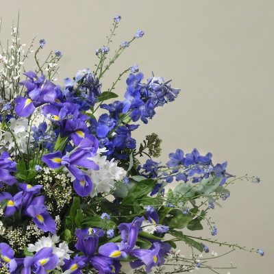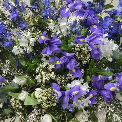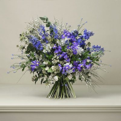 A seasonal take on the timeless blue and white combination, this luxury bouquet features lapis coloured iris, cerulean delphiniums and sky blue forget-me-nots alongside bright white tulips and scented narcissus.