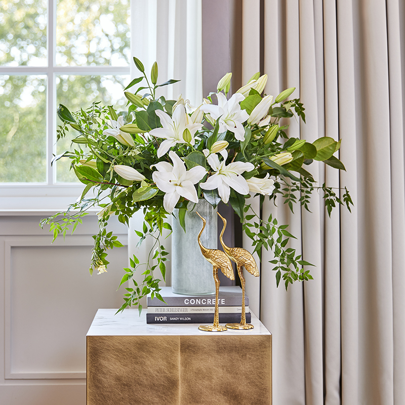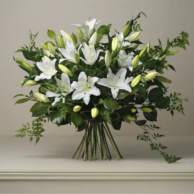 A classic, all white bouquet, The Kew combines the simple elegance of oriental lilies with rich, green foliage.