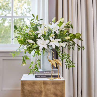 A classic, all white bouquet, The Kew combines the simple elegance of oriental lilies with rich, green foliage.