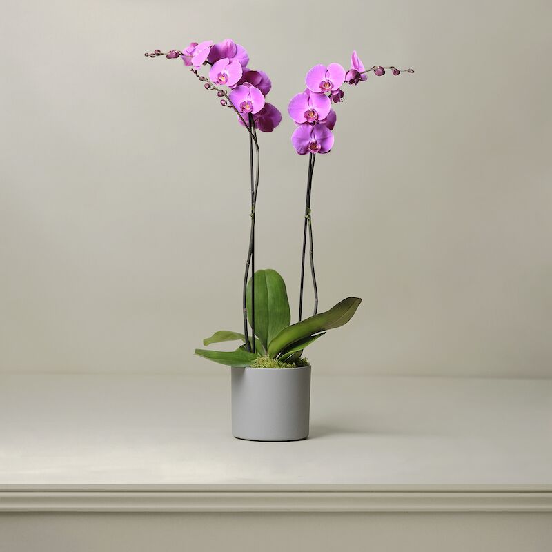 Phalaenopsis orchid plants make a great gift or natural decoration for your own home. Ideal for adding a splash of long-lasting colour to any interior, this luxurious, pink, tall plant has a double flower stem and is presented in a charcoal grey ceramic pot and stands at approximately 90cm tall.