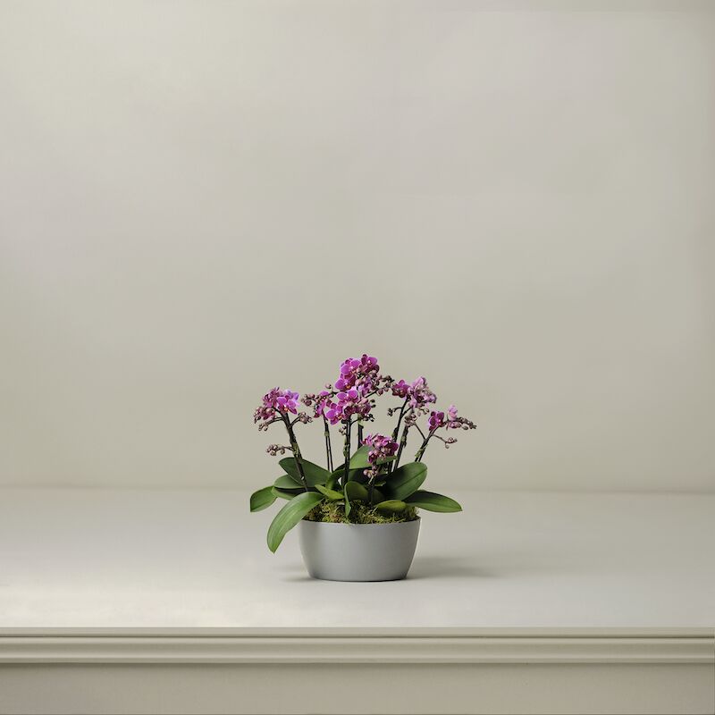 Bright and bold with plenty of character, these miniature pink phalaenopsis orchid plants make a great gift or natural decoration for your own home. This luxury orchid planter is presented in a charcoal grey bowl and stands at approximately 25cm tall.