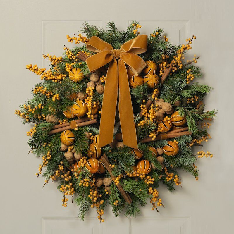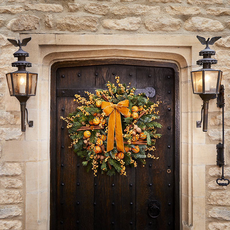 Featuring fragrant dried oranges, cinnamon and walnuts with bright berries and fir, The Lichfield Gold Wreath is a real seasonal staple. Finished with a luxurious velvet ribbon, it is available in a choice of two sizes: