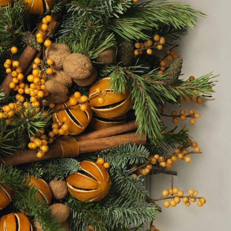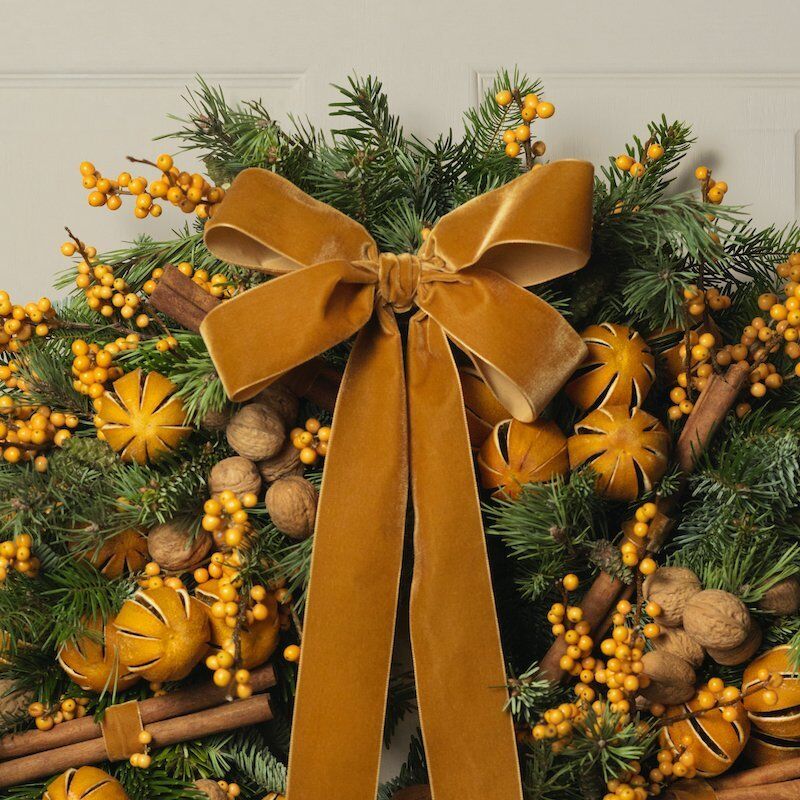 Featuring fragrant dried oranges, cinnamon and walnuts with bright berries and fir, The Lichfield Gold Wreath is a real seasonal staple. Finished with a luxurious velvet ribbon, it is available in a choice of two sizes: