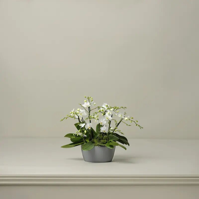 For instant impact in the home or an elegant gifting solution, this ready-made planter of miniature white phalaenopsis orchid plants is fitting for any interior. Our luxury orchid planter is presented in a low charcoal grey bowl and stands at approximately 25cm tall.