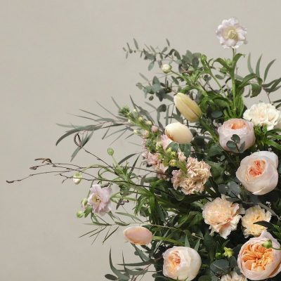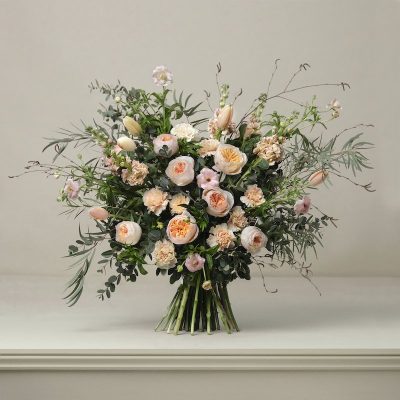 A restrained colour palette of soft peach expressed in the generous, rounded forms of garden roses, textured carnations and elongated French tulips makes this luxurious Paul Thomas bouquet a masterclass in subtle beauty.