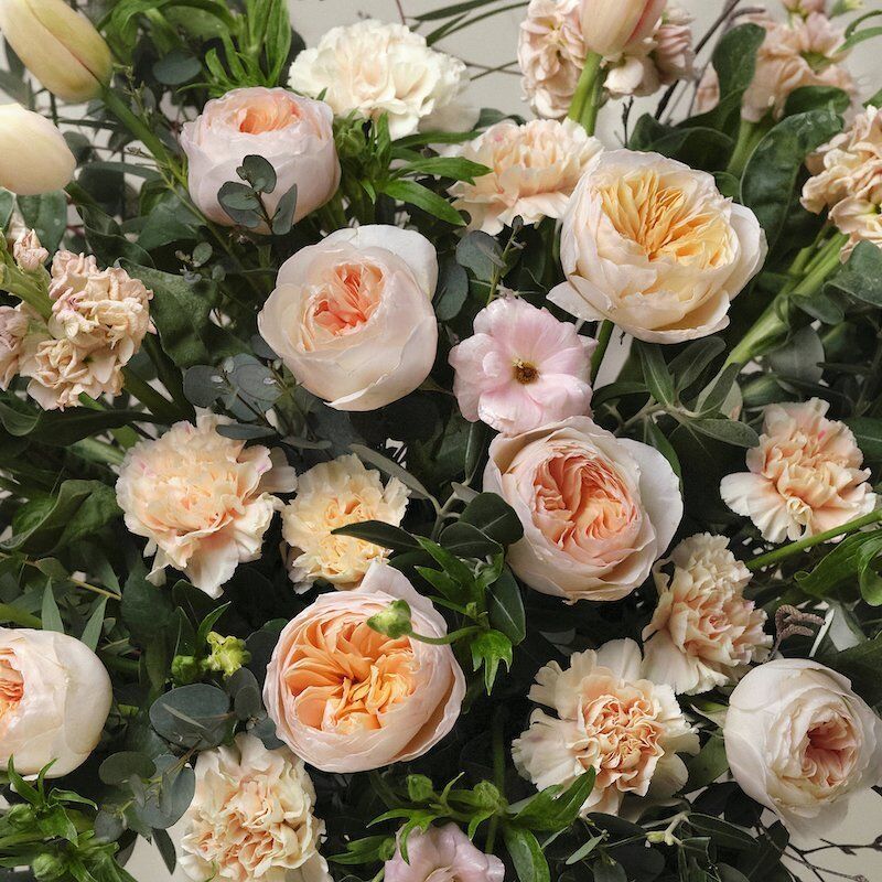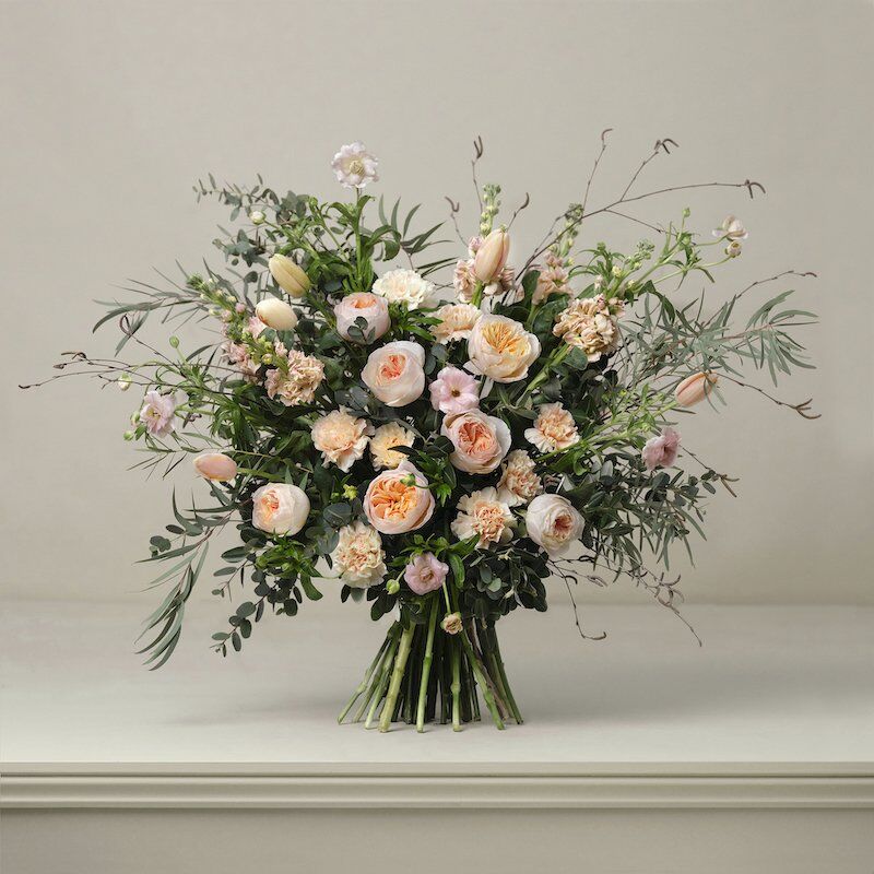 A restrained colour palette of soft peach expressed in the generous, rounded forms of garden roses, textured carnations and elongated French tulips makes this luxurious Paul Thomas bouquet a masterclass in subtle beauty.