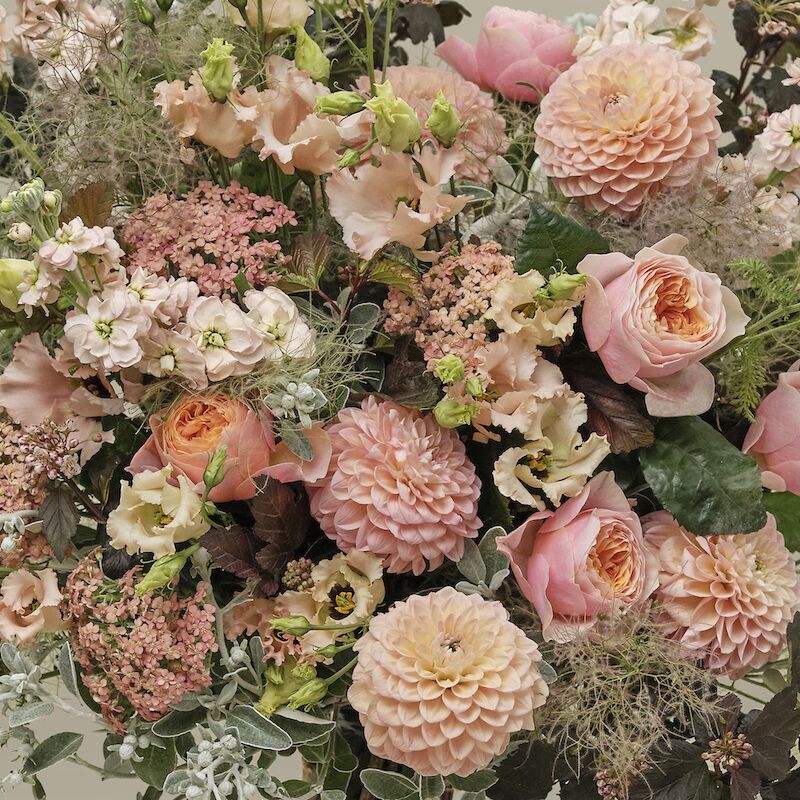 The warming, sunset tones of The Orwell epitomise late summer evenings in the English country garden. Named after the iconic British author, this luxury bouquet combines coral coloured dahlias, garden roses and achillea with contrasting burgundy smokebush and physocarpus foliage.