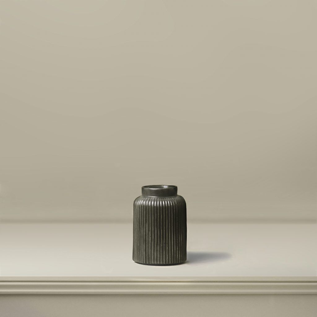 With ridged sides and softly curving shoulders, The Lutyens Vase has a subtly recessed base and narrower neck to hold the flowers perfectly in place. Finished with a matte, charcoal grey coloured glaze this vase has been designed to house our size ’S’ bouquets.