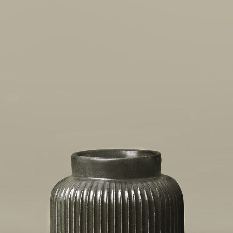 With ridged sides and softly curving shoulders, The Lutyens Vase has a subtly recessed base and narrower neck to hold the flowers perfectly in place. Finished with a matte, charcoal grey coloured glaze this vase has been designed to house our size ’S’ bouquets.