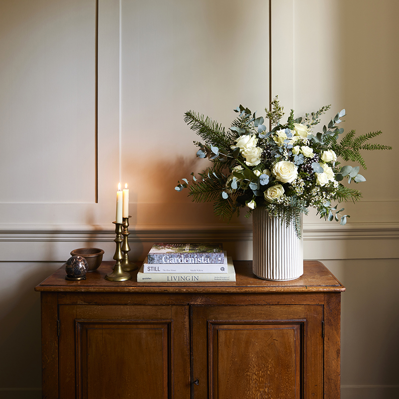 With winter white blooms, silvery seeded eucalyptus, frosted pine cones and scented spruce, The Snowdon is evocative of a winter wonderland under a fresh dusting of snow.