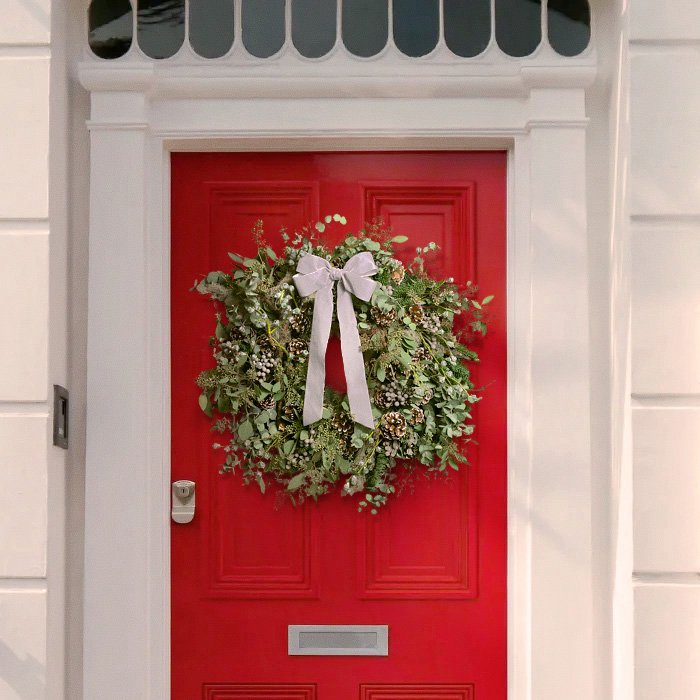 With seasonal grey-green foliage, silvery seeded eucalyptus, frosted pine cones and scented spruce, The Snowdon Silver Wreath is finished with a luxurious velvet ribbon and is available in a choice of two sizes: