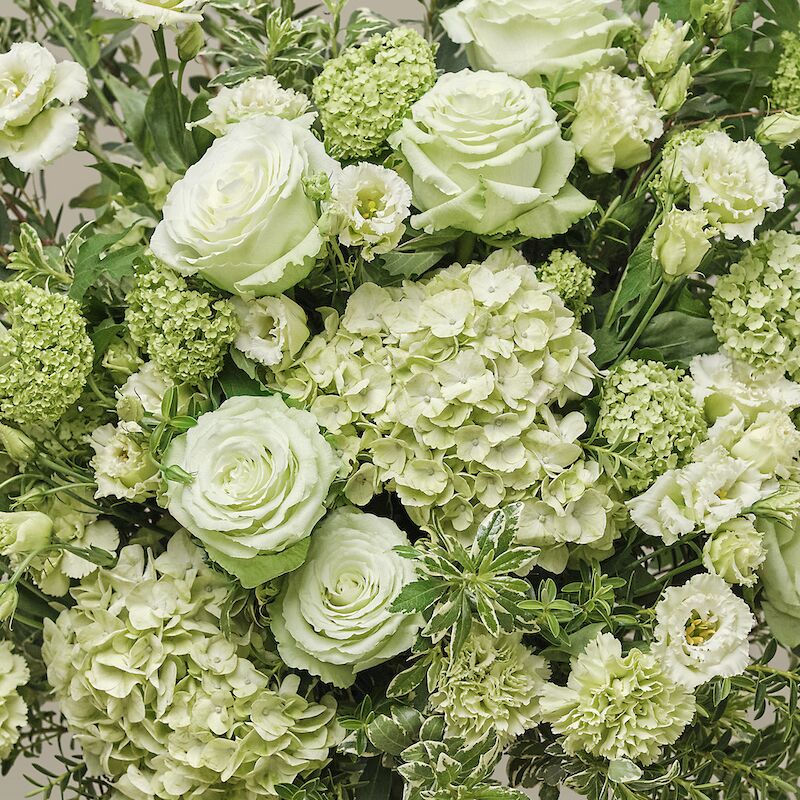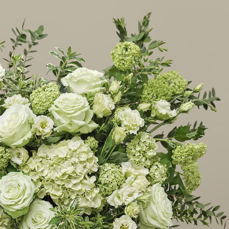 A fresh and vibrant all-green bouquet featuring garden favourites including roses, hydrangea and viburnum, the neutral pistachio tones of The Stourhead have universal appeal.