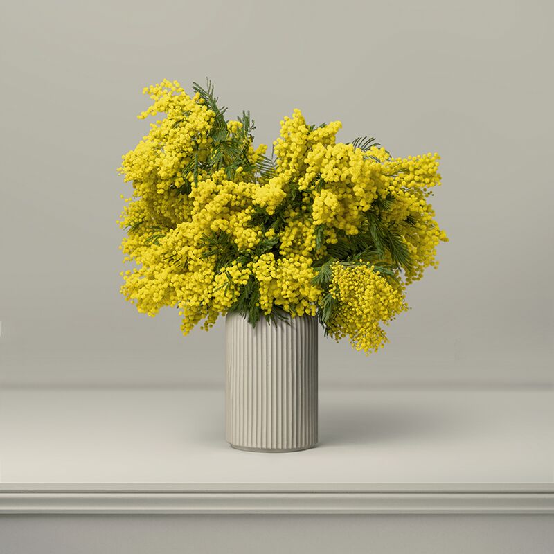 With ridged sides and softly curving shoulders, The Lutyens Vase has a subtly recessed base and narrower neck to hold the flowers perfectly in place. Finished with a matte, light beige coloured glaze this vase houses The Sunshine Mimosa Bouquet in size ’L’. The Sunshine Mimosa, arranged into the Lutyens vase in stone, looks equally at home in both traditional and modern settings.
