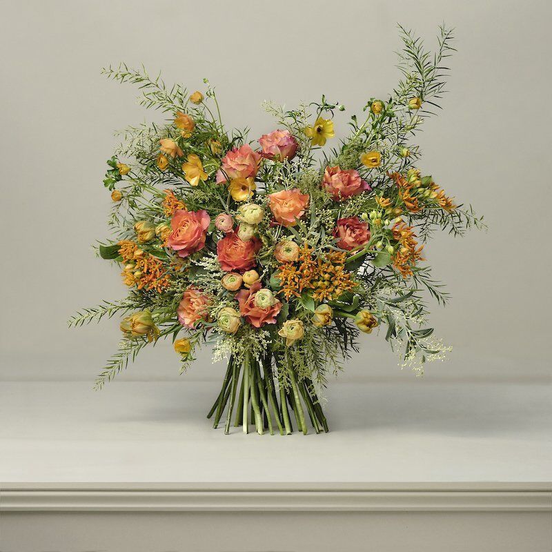 Heralding the coming warmer, brighter days, this Paul Thomas luxury hand-tied bouquet celebrates Spring’s zesty tones with orange ranunculus, golden roses and amber asclepias.