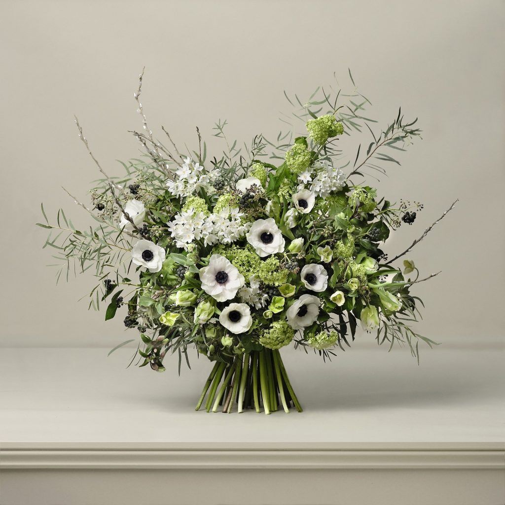 The ever-elegant palette of classic white and green takes on a seasonal guise for Spring with this PAUL THOMAS luxury bouquet combining anemones, paperwhite narcissus, hellebores and viburnum.