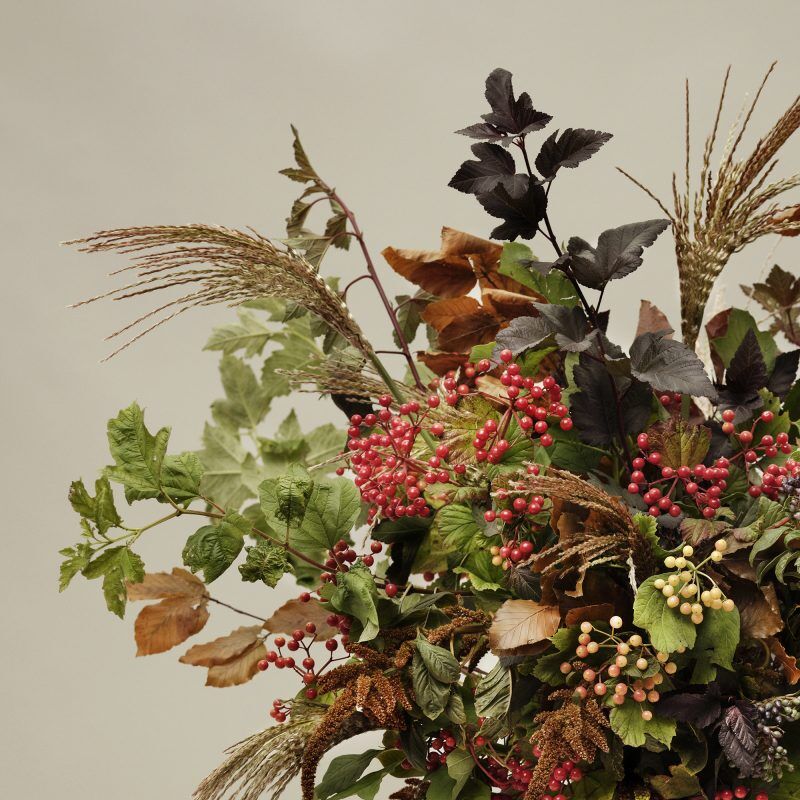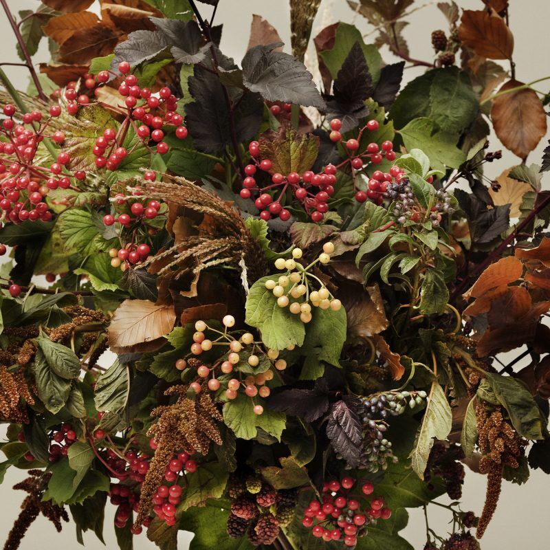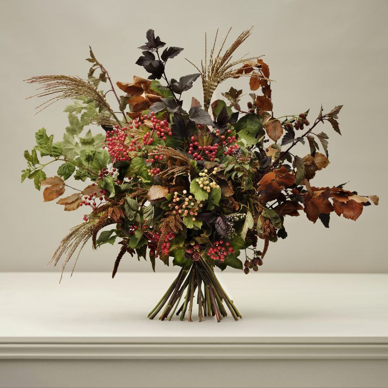 Inspired by autumnal strolls in the English countryside, this wonderfully wild bouquet of British-grown berries and seasonal foliage features an array of warming copper, bronze, ruby red and russet tones. Feathery grasses, viburnum berries and blackberries add texture to this understated, seasonal design.
