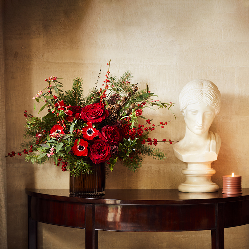 From: £95.00 – £375.00Price range: £95.00 through £375.00Luxurious roses, velvety anemones and bright berries join festive fir, larch branches and pine cones in this classic winter design in traditional red and green.